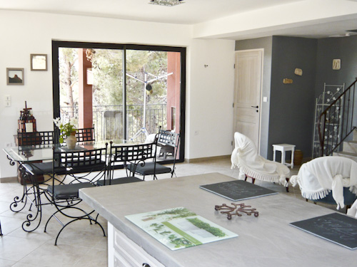Terrasse couverte avec point de vue sur les pinèdes environnantes et les vignes. Vue sur les étangs de Bages depuis la chambre parentale.